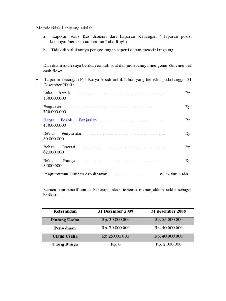 Kembali lagi pada arus kas metode langsung. 06/pm/2000 mengenai pedoman penyajian laporan keuangan dimana mengharuskan perusahaan menyajikan laporan arus kas dengan format metode langsung, . Tujuannya adalah untuk mengetahui kondisi keuangan perusahaan, apakah sedang untung atau justru rugi. Dalam metode tidak langsung, arus kas aktifitas operasional, arus kas aktifitas investasi dan arus kas aktifitas pendanaan disusun berdasarkan . Dalam melakukan penyusunan arus kas terdapat dua metode di dalamnya yaitu metode langsung atau yang disebut direct cash flow dan metode .